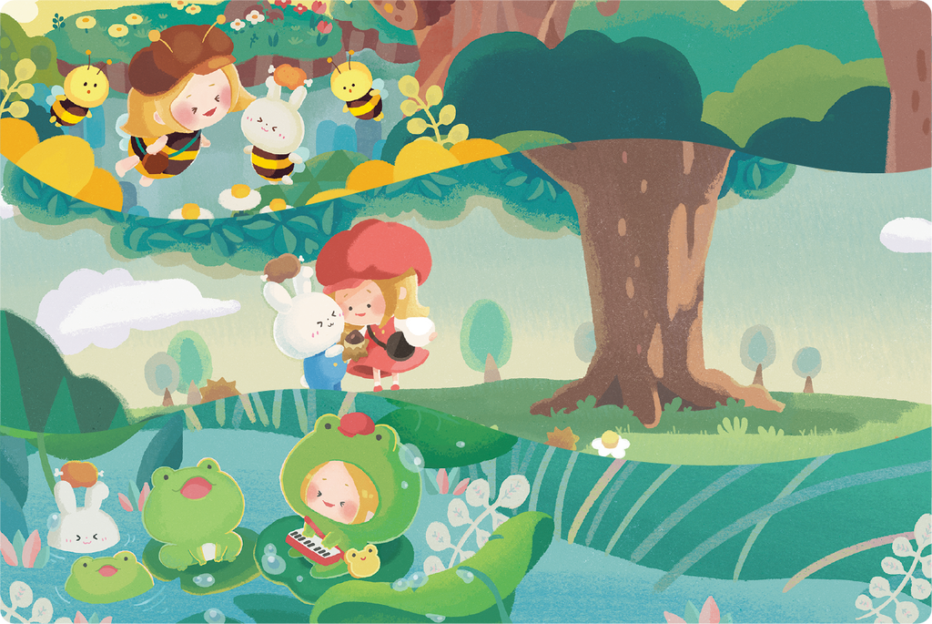 The picture book pages feature illustrations based on the songs, showing the charming Harami-chan and Usami-chan playing happily in the world of nursery rhymes, making it a fun way for children to learn the piano while enjoying the delightful scenes!