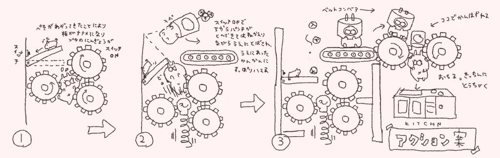 The rabbit “Peso,” who enjoys working, lives in a small apartment building called Chat Heights. While trying to cook in the kitchen, Peso realizes the kitchen is nowhere to be found. Suspecting a system malfunction, a trip to the basement for maintenance reveals tiny residents living there.